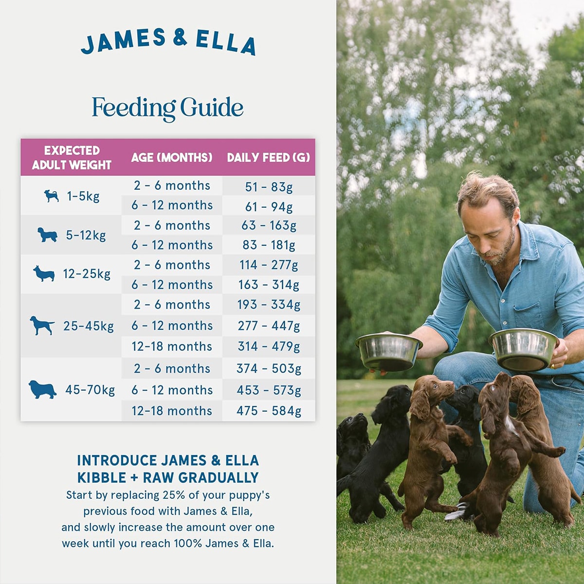 We always recommend that new diets are introduced slowly and carefully to avoid upset tummies, especially for puppies! Start by replacing 25% of your puppy's previous diet with James & Ella's Kibble + Raw, and gradually increase the amount of Kibble + Raw over 7-10 days.