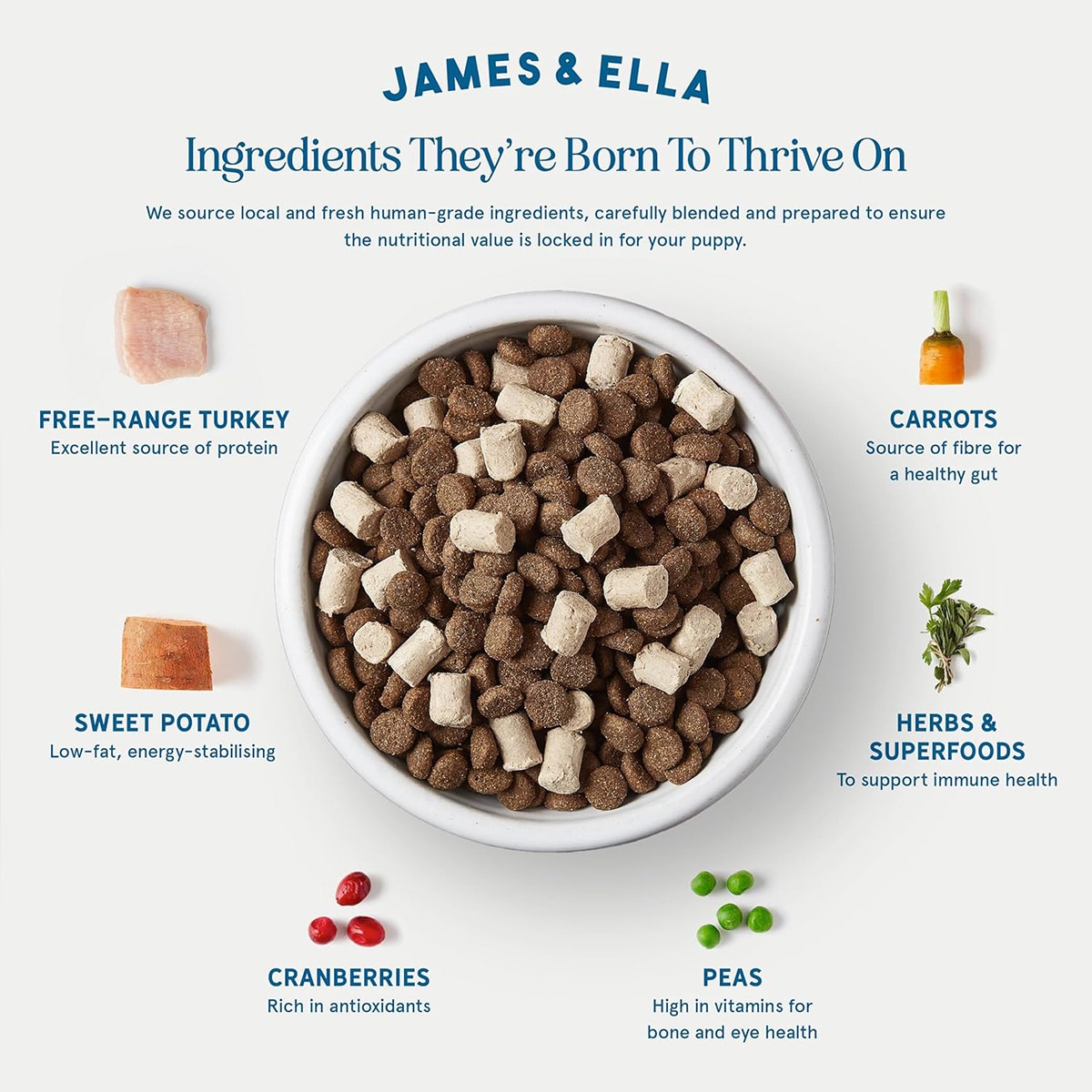 A carefully blended, nutritious mix of high protein turkey kibble combined with freeze-dried raw meat nuggets. James & Ella’s Kibble + Raw is a complete and balanced meal, and the perfect first step in adding a raw boost to your puppy’s diet.
