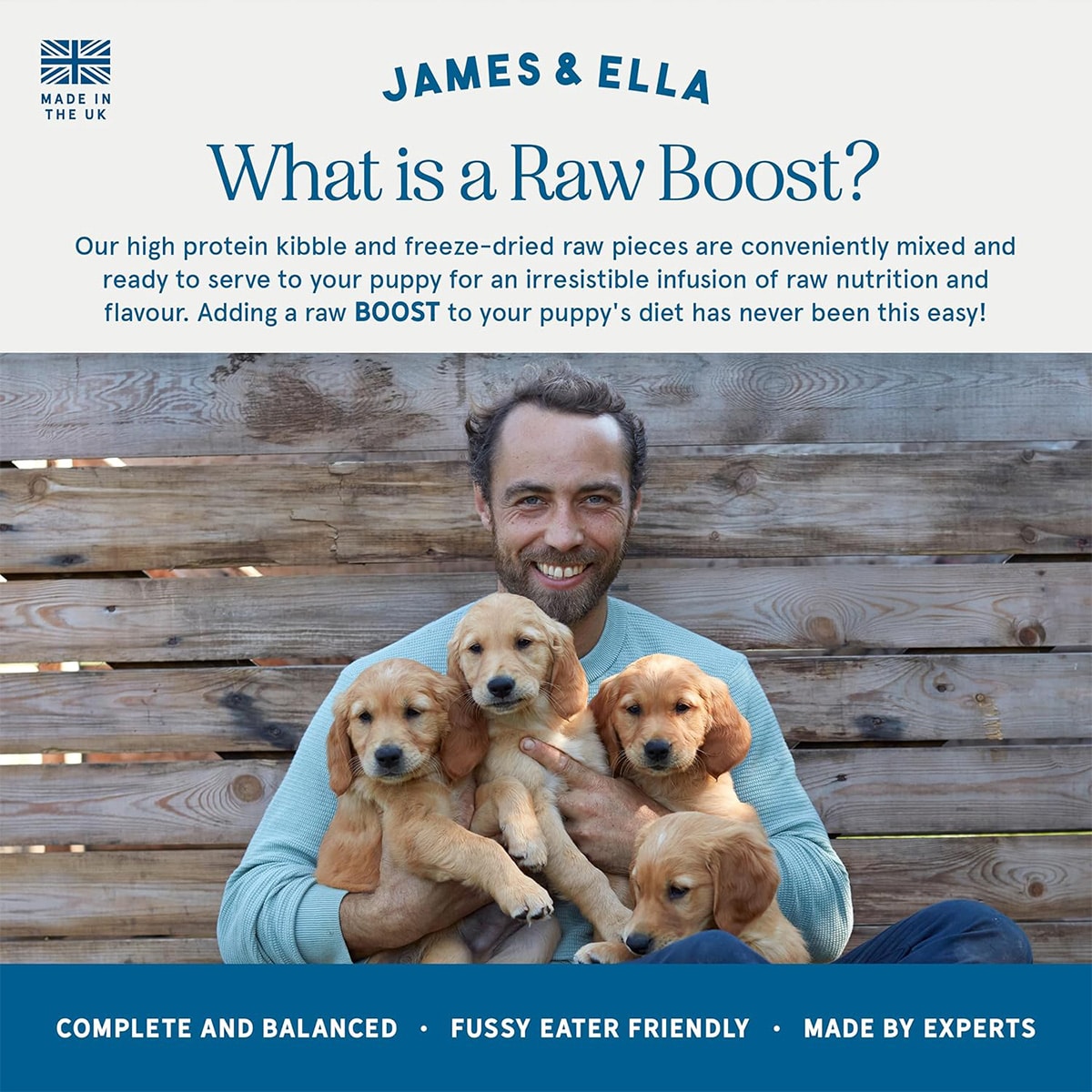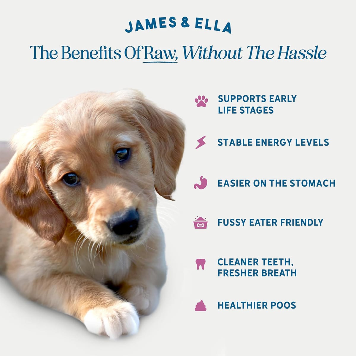 We spent a while trying to find the right food for Cosmo’s sensitive stomach, but we’ve found it in James & Ella - his digestion is so much better now. He absolutely loves the Raw Boost food and I am happy knowing that it has no nasties but all the right nutrients for his growth into a healthy adult dog.